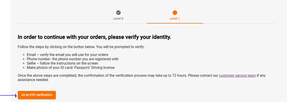 في معظم الحالات، هذا يعني أن حسابك يتطلب التحقق. إذا لم تكن قد أكملت أي تحقق على حسابك حتى الآن، فيرجى تسجيل الدخول والنقر فوق قسم التحقق من KYC / المستوى 2 وبدء العملية. يرجى التأكد من أن لديك جواز سفر / بطاقة هوية أو رخصة قيادة سارية في متناول اليد قبل أن تبدأ. بمجرد اكتمال التحقق بنجاح، سيتم تحديث حالة حسابك تلقائيًا. إذا واجهت أي صعوبات في التحقق، يرجى الاتصال بفريق خدمة العملاء لدينا هنا.