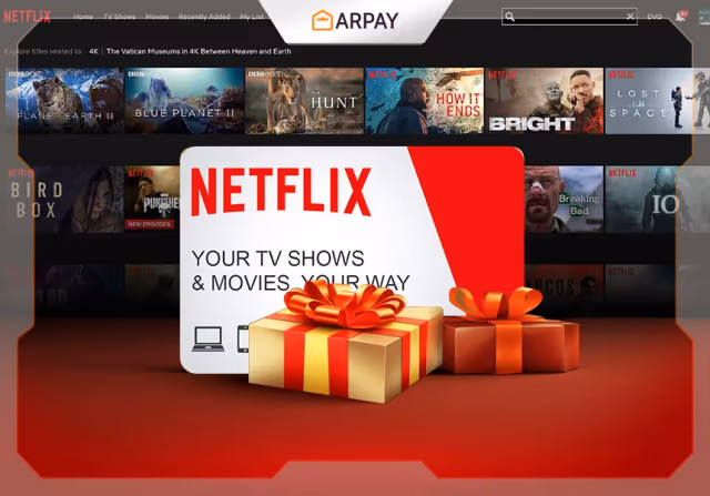 في ARPAY ، نقدم مجموعة متنوعة من بطاقات هدايا نتفليكس لتناسب أي مناسبة. سواء كان ذلك لنفسك أو لأحبائك أو لمجرد إظهار التقدير، فإن بطاقات هدايا نتفليكس هي الهدية المثالية. فنحن نقدم كلاً من البطاقات الرقمية والمادية مع مجموعة متنوعة من خيارات الدفع.