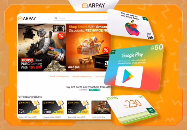 - ARPay es una plataforma de e-commerce que vende tarjetas prepago, gift cards, e-cards para supermercados y juegos y aplicaciones.
