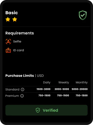 Ya está todo listo.El nivel básico está verificado y tus límites han aumentado.NOTA: Después de verificar el nivel básico, puedesverificar un método de pago para aumentar aún más tus límites de compra.